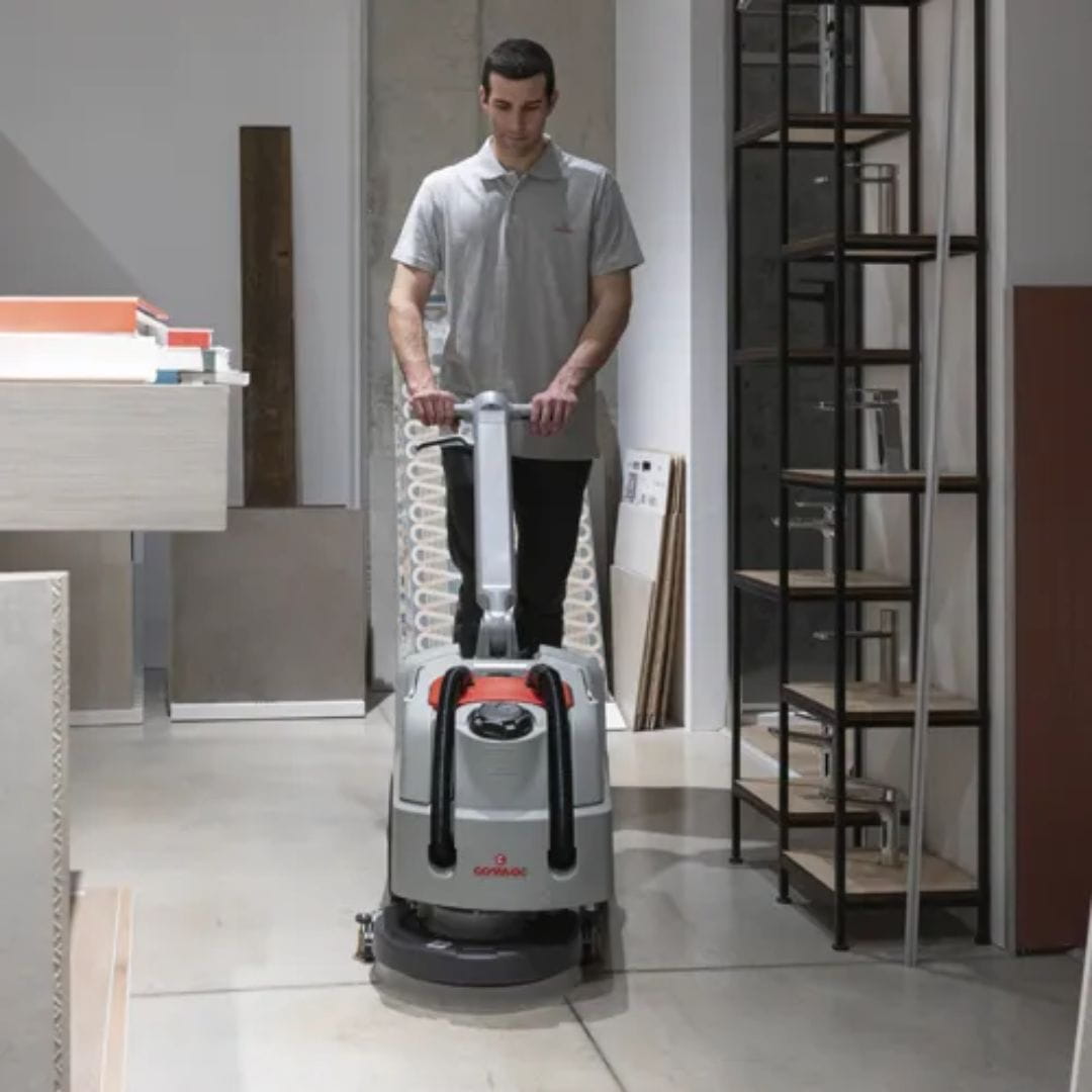 Comac Vispa EVO Li-ion to kompaktowa, profesjonalna szorowarka do podłóg stworzona do szybkiego i bezpiecznego czyszczenia miejsc o dużym natężeniu ruchu. Wyposażona w baterię litowo-jonową, zapewnia do 2 godzin ciągłej pracy, szybkie doładowania oraz wydajność na poziomie 1300 m²/h.