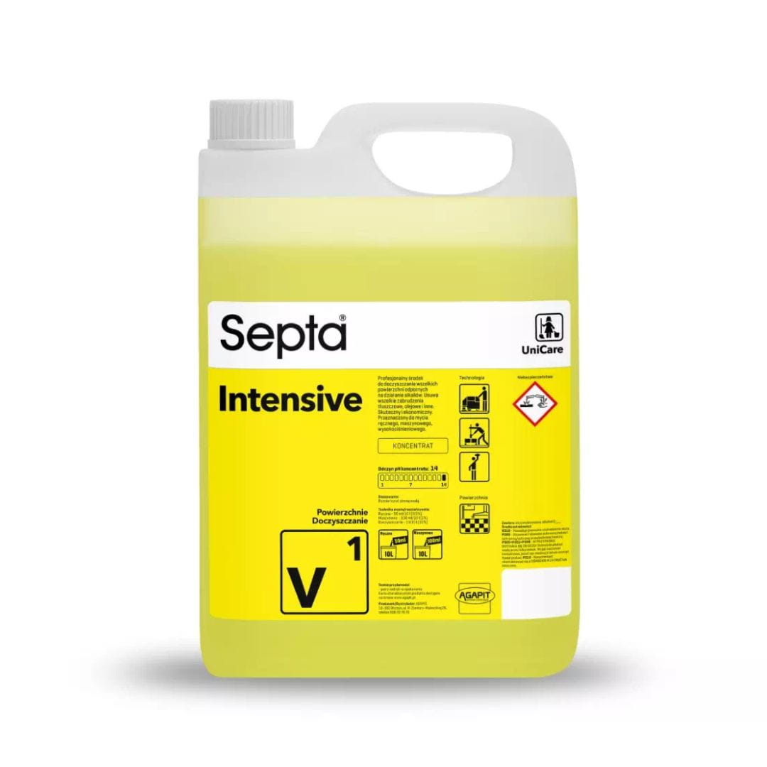 Septa Intensive V1 to profesjonalny środek czystości do doczyszczania wszelkich powierzchni odpornych na działanie alkaliów. Usuwa wszelkie zabrudzenia tłuszczowe, olejowe i inne. Wysoko skuteczny i ekonomiczny.