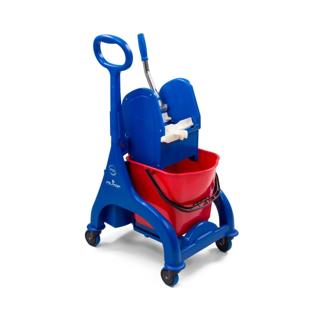 Wysokiej jakości plastikowy wózek do mycia podłóg z uchwytem, jednowiadrowy o pojemności 25 L z wyciskarką szczękowa. Wózek posiada kółka co ułatwia przemieszczanie w trakcie sprzątania. Rączka pozwala na precyzyjne manewrowanie wózkiem.