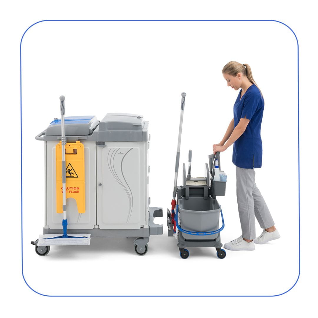 - Dzięki dwóm 25-litrowym wiadrom można oddzielić roztwór czyszczący od wody do płukania, dzięki czemu uzyskuje się lepsze wyniki mycia, wyższą higienę, oszczędność detergentu, skrócenie czasu pracy przy minimalnym wysiłku operatora.