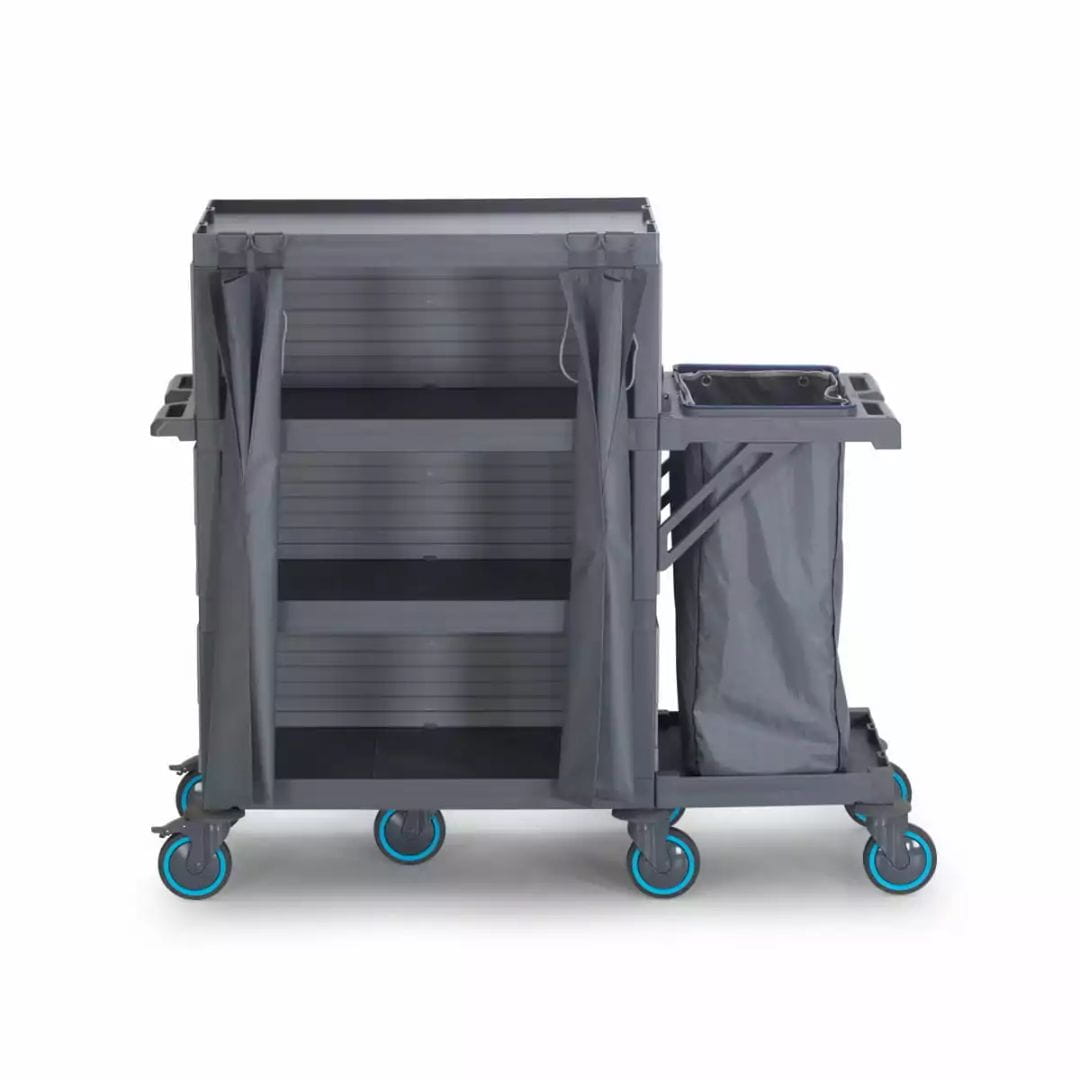Wózek oferuje wygodną organizację pracy dzięki czterem półkom, w tym trzem zabezpieczonym sztywnymi bokami. Dwie kurtyny zasłaniające utrzymują estetykę w przestrzeniach dostępnych dla gości, a pojemny worek 120 L umożliwia szybki odbiór brudnej bielizny. Ergonomiczne uchwyty ułatwiają manewrowanie nawet w ciasnych korytarzach.