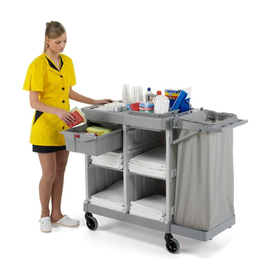 Przemyślana konstrukcja z pionowymi przegrodami pozwala oddzielić czystą bieliznę od brudnej, a składany uchwyt na worek i ergonomiczny drążek ułatwiają transport i przechowywanie wózka. Wózek najlepiej sprawdza się przy obsłudze 8–10 pokoi, zapewniając maksymalną wydajność i higienę pracy.