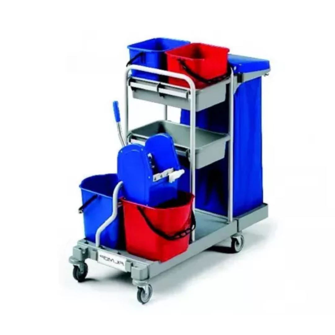 Wyposażony w plastikową podstawę z kołami o średnicy 100mm, 2 ramki, 2 kuwety, wiaderka plastikowe 2x6 l, wiaderka plastikowe 2x15 l z wyciskarką, uchwyt plastikowy na worek na śmieci 120 l z napinaczem i wzmocnieniami.