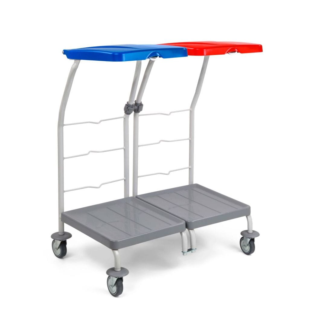 Profesjonalny wózek na odpady 2x70 L z kolorową pokrywą i obrotowymi kółkami ułatwia higieniczny transport odpadów lub bielizny. Trwała konstrukcja z Rilsanu i polipropylenu zapewnia długą żywotność w intensywnych warunkach.